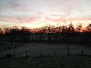 We got down to the barn this morning around 6:40. It was pitch black but the horses were up stirring in their stalls and waiting for their breakfast. We grained all three of them and then put their hay out in the field so they can munch on that when we turned them out. While the boys ate, Anne and I sat down at the barn and watched the sun come up. We see the sunrise every morning when we are down at the barn but this morning we actually SAW IT. It was breath taking.
